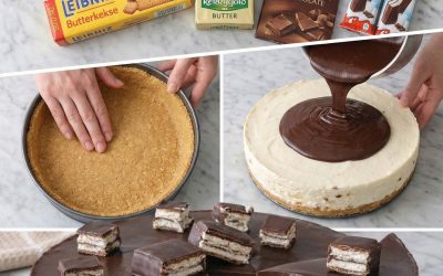 Jetzt den Biskuit in der Mitte durchschneiden, die Creme darauf verteilen und die zweite Hälfte des Biskuits darauflegen. Im Kühlschrank fest werden lassen.